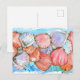 Ett vykort med ett strandtema med lagrar av clam snäcka hand plockade med sepia bläck och målat med skarpa skuggor av laxens rosa och lavendelns vattenfärg accentuerad med spatterfläckar och turkosa blått som bland vågar.