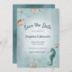 Det moderna strandtemat med bröllop spara datum-kortet har en västerlös havsblå vattenfärgsbakgrund med en sjöbakgrund, segelceller och korall. Perfekt för teman nautiska, tropiska, sommar, destination, kust och bröllop under havet. Originalteckningar av KL Lagrar.