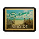 I den här vintagen från Seaside har man en sandstrand med vackra turkoshavet vatten och över havet, ett blå himmel med gigantiska vita moln. I vintage resor stil.