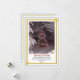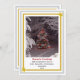 Season's Greetings typography in red italics. Insert Names and Year. Festive snowy Christmas tree and lights. Light gray and gold color geometric border. Greeting message on backside with gray snowflake element. Original Photography Design by TamiraZDesigns.