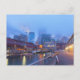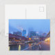 Ett citysslande från Seattle skrumpte i en tjock dimma, med vattenfronten i förgrunden. Byggnad är en blandning av moderna skyscraper och äldre tegelstrukturer, som lyfts upp av varmt insida ljus som står i kontrast till dimmans coola blå toner. En pir sträcker sig in i vatten, tillsammans med restauranger och butiker. En gångväg springa längs vattenfronten, upplyst med gatulampor.