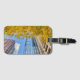 A low-angle shot captures a vibrant autumn scene in a city. The foreground is dominated by a canopy of bright yellow leaves, framing the view of towering buildings. The buildings, with their contrasting textures of glass, brick, and concrete, reach towards a clear blue sky. The sunlight filters through the leaves, casting a warm glow on the scene.