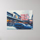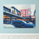Bilden fångar Pike Ställe Market i Seattle i skymningen. Det ikoniska röda neontecknet "PUBLIC MARKET CENTER" visas tydligt ovanför ingången till marknaden och har en klocka. Flera bilar är parkerade i förgrunden. Marknaden går samman med människor, och atmosfären är livlig.