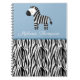 Svart-vit zebramönster täcker den nedre halvan av denna söta anteckningsbok. Den övre halvan är en pastellblå med en söt, kawaii-zebra som står över en mall för att lägga till ditt namn för att anpassa den perfekta presenten.