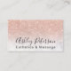 Ett modernt, snyggt Esthetics & Massage-affärskort med elegant modernt, enkelt handskriftsformat stil-typografi i vitt på faux ro guld glitter och vit marmor elegant och trendig bakgrund. All text är elegant, lägg till dina anpassade-medier.