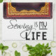 Ett verkligt foto av en viktoriansk kvinna som jobbar hårt på sin "toppmoderna" syning maskin, tillsammans med en logotyp för roligtens anpassningsbar: Sewing är mitt liv!