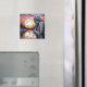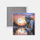 A large figure gazes into a reflective river searching for evidence of fish, surrounded by a colourful sun setting over the landscape