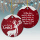 Seek God, Religious Holiday Ceramic Ornament with berry red sparkle glistening glow capturing the Christmas magic and joy of a Christian season. On the back, the sacred writing, Mark 11:24 states, "Therefore I tell you, whatever you ask for in prayer, believe that you have received it, and it will be yours" all in customizable text, ready for you create your favorite bible verse in festive devotional design hanging decorations. Order your Christs teachings testaments today and make your custom inspirational doctrine keepsakes extra special with passages of the word of God! 🎄⛪️