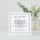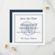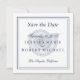 Tungblå text med klassisk gräns över årstidsgränsen. Spara datumet genom att göra ett fet påstående med det här fotofria. Elegant och enkel "spara datumet" på en inbjudan i fyrkantigt format. Information om bröllop på framsidan med adress på baksidan. Anpassa ytterligare med all information du vill ha.