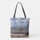 Scenen på Tote Bag är ett originalfoto av ZoeSPEAK av en segelbåt på grund i grunda vatten. I fotot lutas den röda båten åt sidan, inramad av mangrove träd, en sandstrand och ett stort blå himmel fylld med gigantiska vita moln.