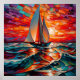 En livfull och färglös bild av en segelbåt som seglar över ett vågigt hav, som är utsatt för en dramatisk solnedgång med nyanser av orange, rosa och turkos. Bilderna har fet form och en abstrakt stil som skapar rörelsekänsla och lugn.