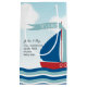 Denna gulliga nyfödd bebispojkegåva hänger lös särdrag ett grafiskt av en gullig segelbåt på vattenvågar och tänder - betonade subtila vitmoln för blå himmel bakgrund. Segelbåten har en flagga att flyga uppifrån med text som läser: Det är en pojke! Anpassadetext i centrera läser: (namn av nya föräldrar) grattis på födelsen av din nyfödd bebispojke.
