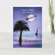 Hawaiiskt temat helgdag-kort från handflatan träd på en strandö och en segelbåt som alla är silhuetterade av ett stort måne när tomten och sömnen går förbi. En roligt hälsning från Hawaii.