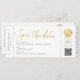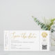 Säckskal i faux guld-folie på ett modernt och minimalistiskt boardingkort flygplan biljett stil sparar datumkortet för ett badbröllop eller ett havstematmottagning, med kodgenerator för anpassningsbar qr och tonvis med utrymme för information om gästresor och logi och ditt foto på baksidan. Det är viktigt att skicka reseinformation till tidigt för destinationsbröllop så att dina gäster hinner planera sitt resa. Det här flygbolaget biljett sparar datumet är perfekt för en chic som är formell eller avslappnad havsytan bröllop med ett program för guld färg, och tryckningen ser mycket ut som äkta folie, även om den trycks i reguljära bläck, skapar den till ett mer överkomligt pris, särskilt för mindre och mikrobröllop. Klicka på 'anpassa ytterligare' om du vill redigera någon del av designen och göra den till en egen, eller checka ut det Pappra Grape Destinations Zazzle Shop för MÅNGA FLER rese- och strandtemat spara datumkorten.