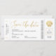 Säckskal i faux guld-folie på ett modernt och minimalistiskt boardingkort flygplan biljett stil sparar datumkortet för ett badbröllop eller en mottagning av havsteman, med tonvis av utrymme för gästinformation och logi på baksidan. Det är viktigt att skicka reseinformation till tidigt för destinationsbröllop så att dina gäster hinner planera sitt resa. Det här flygbolaget biljett sparar datumet är perfekt för en chic som är formell eller avslappnad havsytan bröllop med ett program för guld färg, och tryckningen ser mycket ut som äkta folie, även om den trycks i reguljära bläck, skapar den till ett mer överkomligt pris, särskilt för mindre och mikrobröllop. Klicka på 'anpassa ytterligare' om du vill redigera någon del av designen och göra den till en egen, eller checka ut det Pappra Grape Destinations Zazzle Shop för MÅNGA FLER rese- och strandtemat spara datumkorten.