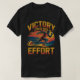 Den svarta t-tröjan innehåller texten "VICTORY STARTS WITH EFFORT" i ett fet, skisserat teckensnitt för gult och orange. I den centrala bilden visas en springer, som verkar vara svart, i rörelse mot en bakgrund av vågrät rand i skuggor av orange, gult och blått, vilket tyder på ett spår eller en horisont. Utformningen är ett motiv och ett idrottstema.