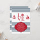 En livlig, nautisk årsdagsinbjudan för älskande och sjömän. Den vita bakgrunden har blåa ränder och röda nautiska motiv. Ordet kärlek har ett roder i stället för bokstaven "o". (FP)