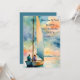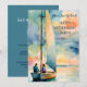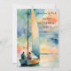Inbjudan till en glad pensionsfest designad med ett akvarellsegelbåtstema i nyanser av blått, orange och turkos. Framsidans text lyder: Vänligen kom och delta i, en glad pensionsfest, mot en bakgrund av ett par som seglar in i solnedgången. Baksidans text innehåller: För att hedra, Paret Namn, Datum, Tid, Plats, Adress och RSVP-information. För att anpassa, infoga bara din text i vår enkla mall och ersätt exemplet.