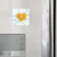 Hjärtformad bit av orange frukt med vatten stänk mot vit bakgrund.