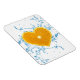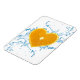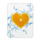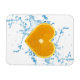 Hjärtformad bit av orange frukt med vatten stänk mot vit bakgrund.