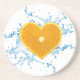 Hjärtformad bit av orange frukt med vatten stänk mot vit bakgrund.