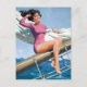 Klassiskt Pinup-kort som visar en brunette Pinup Girl pockar på en segelbåt, målad av Arthur Sarnoff (1912-2000)