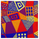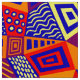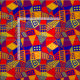 En ursprunglig abstrakt mönster som består av trianglar och rektanglar som dekoreras på olika sätt och ser ut som byggnad och hus