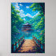 Step into a world of breathtaking tranquillity with this vibrant, anime-inspired Japanese landscape art print. This stunning piece captures a picturesque wooden pagoda nestled over a sparkling, azure lake, surrounded by a lush, emerald forest.