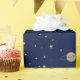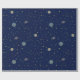 Den kelestiella temaomslutningen papper med rymden mönster, planeter och stjärnor på mörk blått himmel.