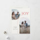 Dessa 5" x 7" platta vykort har platser för tre foton, två namn, år och ett meddelande. Framsidan har två välvda foton, ett vertikalt och ett horisontellt. Greetings är "Glädje" med röda bokstäver. Bakgrunden är elfenben. Baksidan har ett vertikalt foto. Det anpassningsbara meddelandet lyder "Vi är överlyckliga att kunna meddela att vi har blivit förlovade och vi önskar er båda fred och glädje under semestern och under det kommande året."