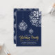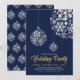 Fira säsongen med denna inbjudan till fest. Denna design har vackra snöflingor kulkulor med ett guld- och marinblått färgtema.