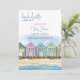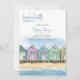 Inbjudan till strandmöhippa med program. Akvarelldesign med en rad färgglada, målade trähus på stranden med gyllene sand, med fri utsikt över havet och sommarblå himmel. Mallen är inställd för att du ska kunna lägga till detaljer om helgen och arrangören med din helgdag på baksidan. Om du behöver göra justeringar av rubriker eller mellanrum, till exempel, klickar du på "redigera med designverktyg".