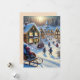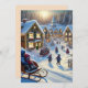Ett semesterkort som visar en charmig snöig by där barn glatt åker släde och omfamnar äventyrets och undrets anda.