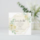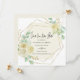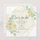 Ett elegant för att låta vänner och familj veta att du har lagt om ditt bröllop. Ett geografiskt ram i guld omger din datuminformation om bröllop. Den mjuka, elfenbensvit bakgrunden markerar texten. Spara Vårt nya datum är skrivet i ett modernt skript, med efterföljande detaljer. Mycket söt vit ros som är inkapslat i sage grönt löv dekorerar det geometriska guld ram. Sparan vår nya datumkortsbakgrund är beige.