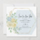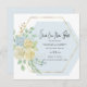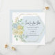 Ett elegant för att låta vänner och familj veta att du har lagt om ditt bröllop. Ett geografiskt ram i guld omger din datuminformation om bröllop. Den blå bakgrunden markerar texten. Spara Vårt nya datum är skrivet i ett modernt skript, med efterföljande detaljer. Mycket söt vit ros och blåa vattenområden som är inkapslade i sage grönt löv dekorerar det geometriska guld ram. Sparan vår nya datumkortsbakgrund är ljusblå.