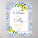 Vår blåa keramiska bricka mönster i Italien-Medelhavsområdet, som är parad med sunt färgade gult grönt-färgscitroner, skapar ett färskt och modernt välkomsttecken från bröllop som säkert imponerar! Med ett modernt penselskript för båge och elegant. Impress dina gäster med det här trendiget och den unika designen som kommer att få alla att prata.