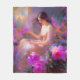 En AI-genererad målning av en vacker kvinna omgiven av rosa och lila blommor