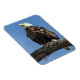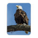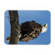 En havsörn på en trädgren som stirrar uppåt som om i eftertanke. Bilden förhöjs av den ljusblå himlen.