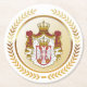 Serbiens nationella jacka i arm inkorporeras i en utrimad cirkel i Faux guld och denna cirkel placeras inuti en fåraktig guld lagerkrans.