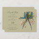 Den här inbjudan "Spara datum" som presenterar en bra och känslig design fångar det väsentliga i ett romantiskt firande. På framsidan finns en sammankomst av papegojor, deras fjädrar, en konditori av sylt, kalk och olivgröntar, som har förbättrats med safiblåa fjädrar från svan, som alla är genomträngda i harmonisk balans på gren. Bakgrunden till en mjuk beige canvas belyser en marin blå dekorativ oval, som försiktigt fastnar med sprayer av persiko-, - och elfenbensbesprutade blommigtar, tillsammans med grönt löv. Den omvända sidan bär samma palett i färg och visar ett parakorpar som representerar paret, mitt i samma botaniska splendor. Den klassiska och elegant-typografin tillför en sofistikerad beröring och skapar den här inbjudande perfekten för att tillkännage ett kärlek som är lika hållbart som naturen själv.