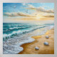 En stillastående strandscen som visar försiktigt vågar som överlappar sandstranden under ett färglöst himmel, som innehåller sjöhäckar och fiskmås som flyger över.
