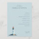 This elegant wedding program features a serene light blue background with a minimalist layout, creating a calm and inviting atmosphere. The design includes a charming lighthouse illustration at the bottom left, adding a touch of coastal charm. Centered text in a classic serif font outlines the ceremony details, ensuring clarity and formality. Customizable date and location placeholders allow for personalization, making it perfect for couples seeking a modern yet understated aesthetic for their special day.