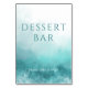 This elegant wedding tabletop sign features a soft, watercolor background with a gradient transitioning from light blue to deeper teal and turquoise hues. The design includes the phrase "DESSERT BAR" in large, uppercase serif letters, accompanied by "please take a treat" in smaller, delicate sans-serif font, both harmonizing beautifully with the muted color palette. The minimalist composition emphasizes clarity and sophistication, creating a serene and inviting atmosphere perfect for encouraging guests to indulge in sweet treats at your event.