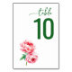 This elegant wedding table card features a minimalist design with a clean white background. The number "10" is prominently displayed in bold, green typography, complemented by the word "table" written in a soft cursive script above it. Two beautifully illustrated pink peonies add a touch of natural charm to the bottom left corner. The combination of fresh greens and pinks creates a serene and sophisticated mood, perfect for enhancing your wedding decor with a modern yet timeless aesthetic.