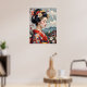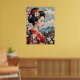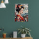 Den här målningen är en serene porträtt av en japansk kvinna som är klädd i en pulserande röd kimono med vita blommönster. Hennes hår är präglat av en traditionell uppdo med vita blommor och ornerade hårnålar. Med sitt ögon försiktigt stängda har hon ett fredligt uttryck, eftersom hon står mot en bakgrund av ett pagoda, ett snö-skyddat berg, och blommar körsbärsberget grenar.