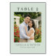 This wedding table card features a classic and elegant design with a soft pastel green background, creating a serene atmosphere. The layout includes a central photo placeholder surrounded by clean, serif typography that adds a touch of formality. Floral motifs are subtly suggested through the garden setting in the blurred background, enhancing the romantic theme. The overall style blends modern minimalism with timeless charm, making it perfect for an intimate and sophisticated wedding celebration.