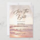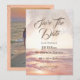 Precis som det vackra, lugnande vattenen på stranden kommer Spara datum meddelande att ta med det helt och hållet. En tropisk inställning av handflatan grenar överst, över havet vinkarare och solnedgång på framsidan med information om anpassadet. En persikobakgrund, korallbakgrund med gyllene sepiakuddar och även ditt favoritfoto.