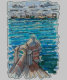 En serenkustscen med en byggande struktur i förgrunden på en färglös blå vatten-kropp, troligen en kanal eller lagun. I bakgrunden finns det båtar flytande på vatten under ett grumligt himlar.