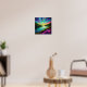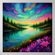 This whimsical poster features a vibrant landscape painting of a serene river with reflective waters, surrounded by lush pine trees and vivid pink and orange flowers under a swirling, colorful sky. Finished as an oil paint art print.