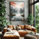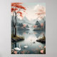 Ett lugnt landskap med mjuka berg och en stillsam sjö, prydd med körsbärsträd med livfulla röda blommor. Vita svanar glider över vattnet och skapar en scen av frid och naturlig skönhet. En inbjudan till eftertanke och avkoppling.